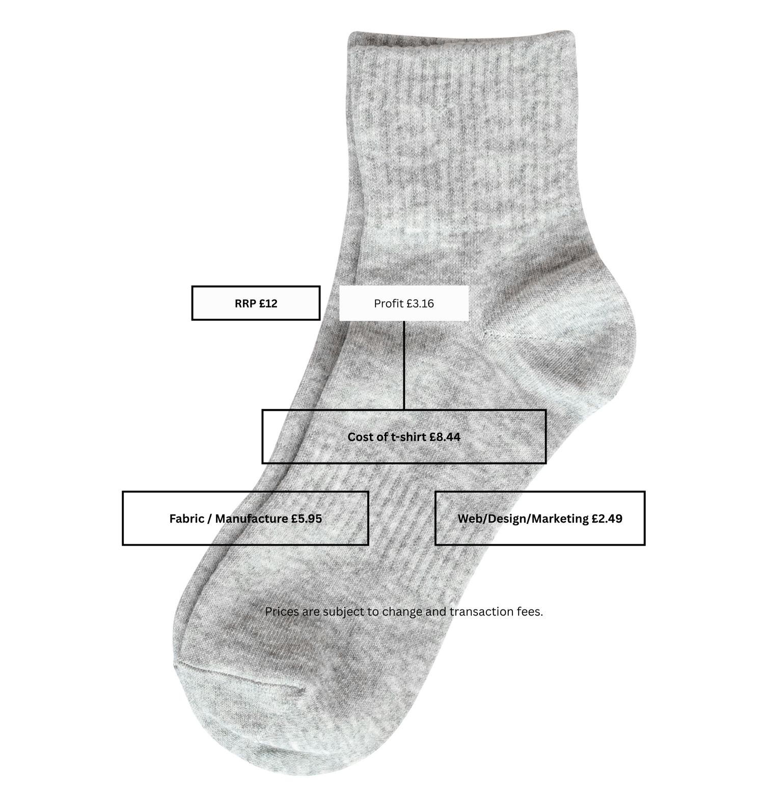 It starts with the base cost—for example, a t-shirt that costs us £8.81 (including VAT), we then add a small markup to cover things like shipping, website costs, and operations, along with a modest profit to keep our mission going.