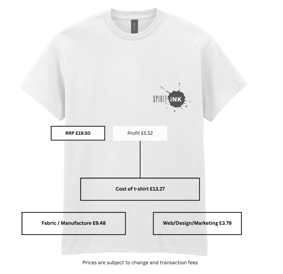 We start with the supplier’s base price—for example, a t-shirt that costs us £8.65. We then add a service fee that covers our costs such as website maintenance, transaction fees, product development, and salaries. This fee also allows us to maintain a modest profit so we can continue investing in our mission to support schools.