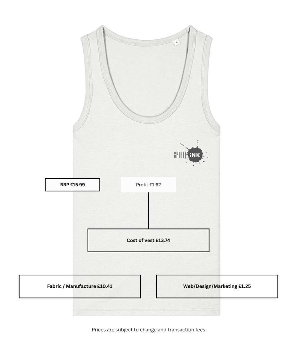 We start with the supplier’s base price—for example, a t-shirt that costs us £8.65. We then add a service fee that covers our costs such as website maintenance, transaction fees, product development, and salaries. This fee also allows us to maintain a modest profit so we can continue investing in our mission to support schools.