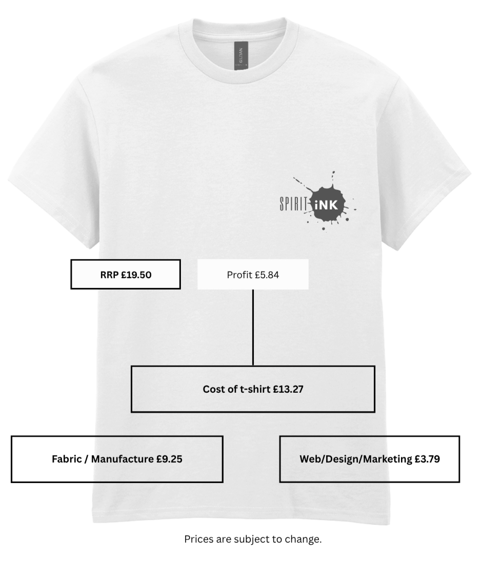 We start with the supplier’s base price—for example, a t-shirt that costs us £8.65. We then add a service fee that covers our costs such as website maintenance, transaction fees, product development, and salaries. This fee also allows us to maintain a modest profit so we can continue investing in our mission to support schools.